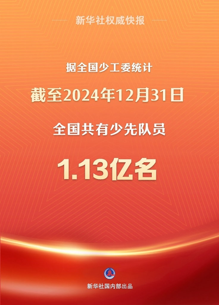 新華社北京5月31日電 記者31日從共青團(tuán)中央獲悉,據(jù)全國(guó)少工委統(tǒng)計(jì),截至2024年12月31日,全國(guó)共有少先隊(duì)員1.13億名,中小學(xué)校少先隊(duì)大、中隊(duì)輔導(dǎo)員305.4萬(wàn)名。中小學(xué)校少工委17.6萬(wàn)個(gè)、少先隊(duì)大隊(duì)17.9萬(wàn)個(gè)、中隊(duì)287.4萬(wàn)個(gè)。