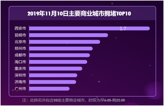 高德地圖對(duì)國(guó)內(nèi)20座重點(diǎn)商業(yè)城市的全天擁堵指數(shù)預(yù)測(cè)顯示,西安以相較平時(shí)周末增長(zhǎng)8%的數(shù)字領(lǐng)跑全國(guó),擁堵延時(shí)指數(shù)達(dá)到1.73,明顯超過(guò)排名第二的昆明,成為今年“天貓雙11”線下出行最為“火爆”的城市。