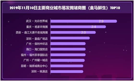 數(shù)據(jù)顯示,11月10日,盒馬鮮生所在區(qū)域易發(fā)生擁堵商圈排名前十位的依次是,武漢光谷世界城、重慶楊家坪、西安曲江大唐不夜城、深圳皇庭廣場(chǎng)店、廣州保利中環(huán)、??趪?guó)貿(mào)、福州茶亭國(guó)際、廣州曜一城、昆明瑞鼎城和深圳桃源。