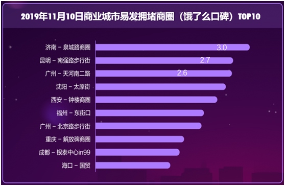 口碑餓了么線下商戶所在區(qū)域易發(fā)生擁堵商圈排名前十位的依次是,濟(jì)南泉城路、昆明南強(qiáng)步行街、廣州天河南二路、沈陽(yáng)太原街、西安鐘樓、福州東街口、廣州北京路步行街、重慶解放碑、成都銀泰中心in99和??趪?guó)貿(mào)。