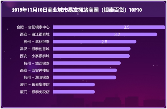 銀泰百貨所在商圈中前十位易發(fā)生擁堵的分別為合肥銀泰中心、西安曲江銀泰城、杭州武林銀泰、武漢銀泰創(chuàng)意城、西安小寨銀泰城、杭州城西銀泰、西安鐘樓銀泰、杭州湖濱銀泰、廈門(mén)銀泰集美店和廈門(mén)銀泰免稅店。