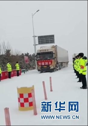 2月14日,內(nèi)蒙古多地普降大雪,從赤峰出發(fā)的運輸車輛,在當?shù)亟痪淖o送下順利踏上征途。沿途的交警列隊敬禮,目送車隊離去。