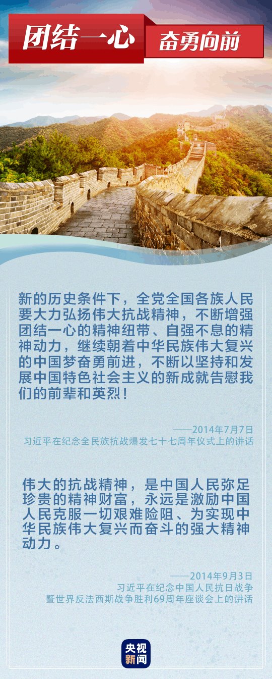 “偉大的抗戰(zhàn)精神,永遠(yuǎn)是激勵(lì)中國人民克服一切艱難險(xiǎn)阻、為實(shí)現(xiàn)中華民族偉大復(fù)興而奮斗的強(qiáng)大精神動(dòng)力?!薄罢x必勝!和平必勝!人民必勝!”黨的十八大以來,習(xí)近平總書記多次談到抗戰(zhàn)精神。讓我們重溫總書記重要論述,銘記歷史、奮勇向前。