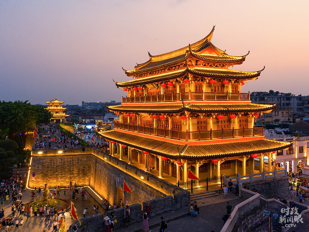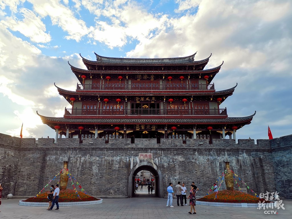 △修復后的廣濟門城樓高24.5米,城樓上的“東為萬春”和“嶺東首邑”分別由國際漢學大師饒宗頤、書法家劉炳森題寫。(總臺央視記者楊立峰拍攝)