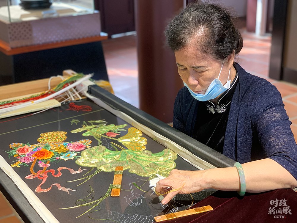 △目前廣濟樓樓內一、二樓分別辟為“潮州通史展”和“潮州非物質文化遺產陳列展”展廳。這是潮州刺繡。(總臺央視記者郭晗光拍攝)