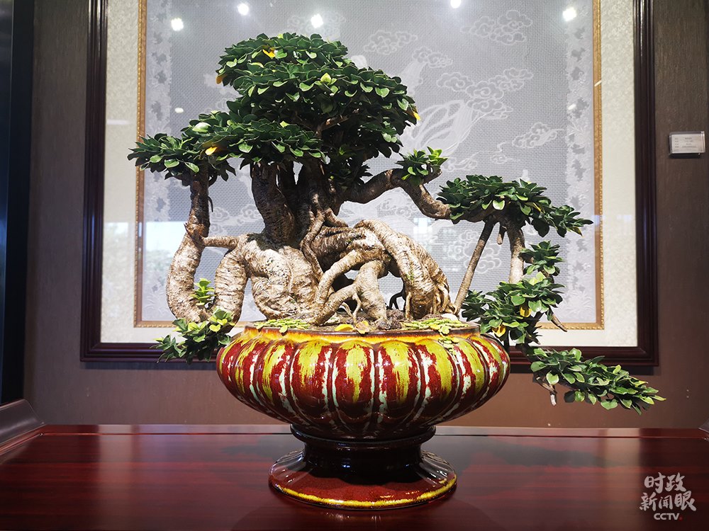 △楓溪瓷燒制技藝是國家級非物質文化遺產之一,這是作品《榕樹盆景》。(總臺央視記者張曉鵬拍攝)
