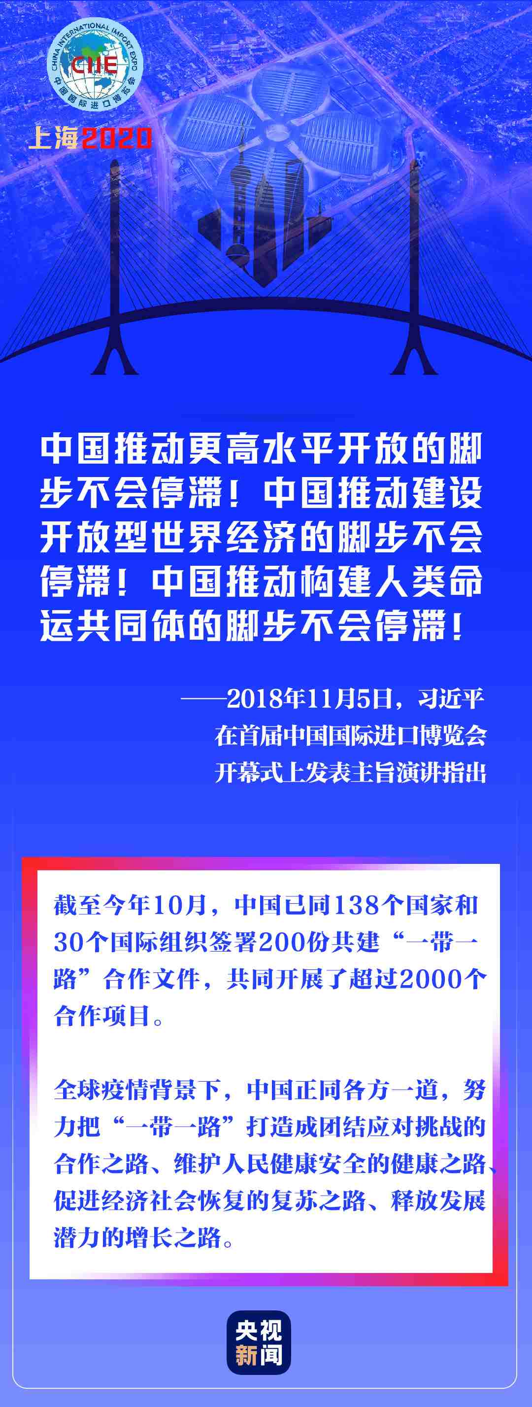 在新冠肺炎疫情全球蔓延、世界經(jīng)濟(jì)持續(xù)低迷的非常時(shí)期,進(jìn)博會(huì)如期而至,為世界各國各地區(qū)搭建通往更多市場(chǎng)機(jī)遇、投資機(jī)遇、增長機(jī)遇的橋梁。