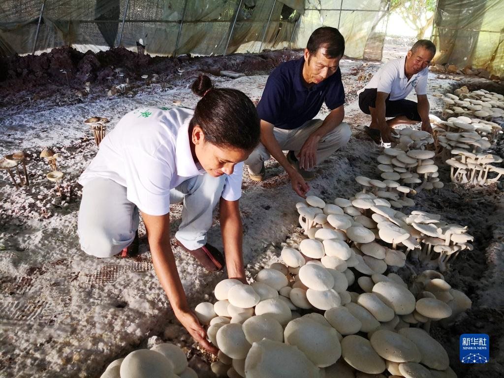 2018年6月12日,在斐濟楠迪,中國專家和當(dāng)?shù)毓蛦T檢查菌菇生長情況。新華社記者張永興攝