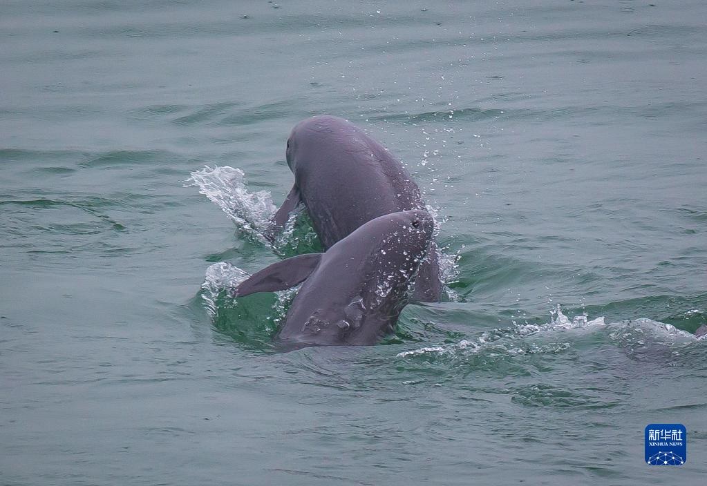 5月10日,在湖北省宜昌市江邊,長江江豚在水中嬉戲。新華社記者肖藝九攝