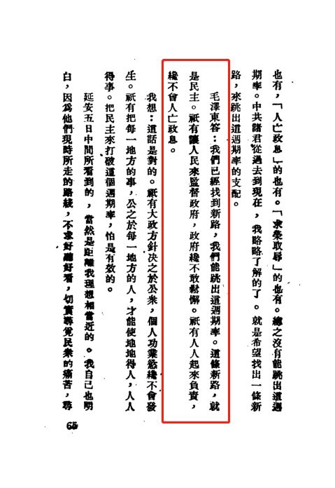 毛澤東同志的回答干脆果斷:“我們已經(jīng)找到新路,我們能跳出這周期率。這條新路,就是民主。只有讓人民來監(jiān)督政府,政府才不敢松懈。只有人人起來負(fù)責(zé),才不會(huì)人亡政息。”