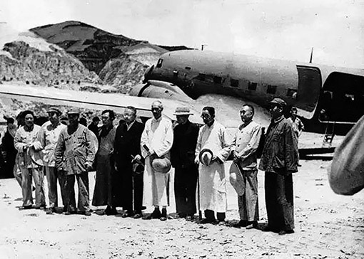 1945年7月,國(guó)民參政會(huì)參政員黃炎培等六人飛抵延安,同中國(guó)共產(chǎn)黨商談兩黨團(tuán)結(jié)、共建國(guó)內(nèi)和平問題,毛澤東等親臨機(jī)場(chǎng)歡迎。圖:新華社