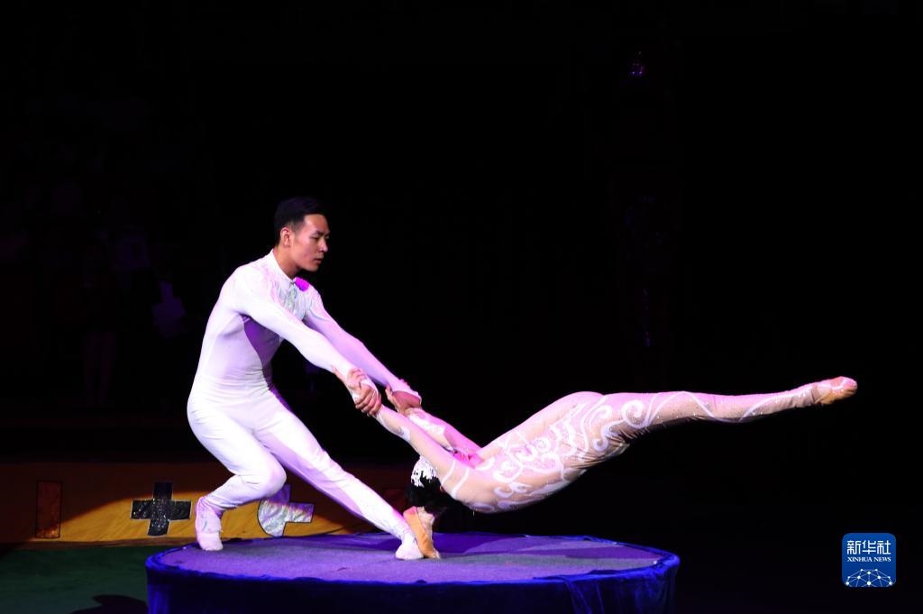 2019年9月4日,在蒙古國首都烏蘭巴托,中國河北省滄州市雜技團演員表演雜技。新華社發(fā)(蘇力雅/攝)
