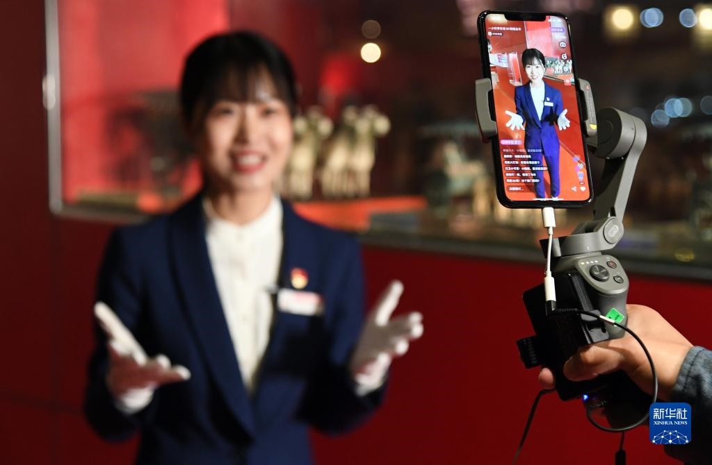 2020年4月30日,在北京汽車博物館,講解員曾紅娟通過網(wǎng)絡直播平臺為觀眾介紹館內(nèi)的藏品車。新華社記者 任超/攝