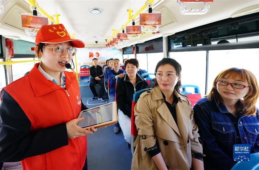 河北省唐山市海港經(jīng)濟(jì)開發(fā)區(qū)志愿者宣講員在紅色主題公交車上給乘客講革命故事(5月10日攝)。新華社記者楊世堯攝
