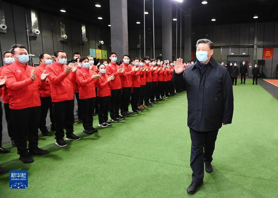 1月4日,中共中央總書記、國家主席、中央軍委主席習(xí)近平在北京考察2022年冬奧會、冬殘奧會籌辦備賽工作。這是4日下午,習(xí)近平在二七廠冰雪項目訓(xùn)練基地專項體能訓(xùn)練館,向運(yùn)動員、教練員、服務(wù)保障人員揮手致意。新華社記者 謝環(huán)馳 攝