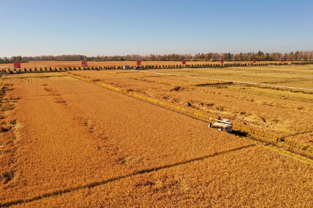 2021年10月12日,在吉林省吉林市永吉縣萬(wàn)昌鎮(zhèn),農(nóng)民駕駛農(nóng)機(jī)收割水稻(無(wú)人機(jī)照片)。新華社記者張楠攝