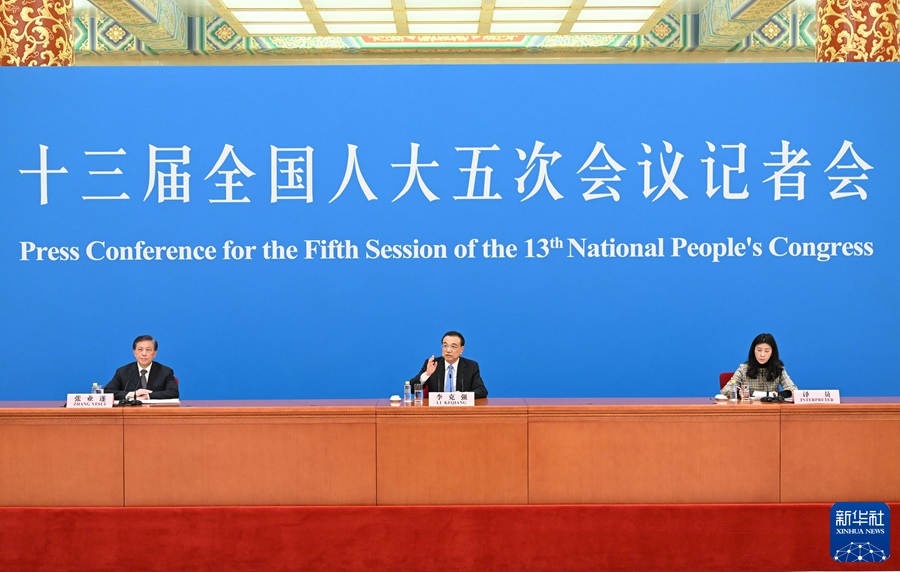 3月11日上午,十三屆全國人大五次會(huì)議在北京人民大會(huì)堂舉行記者會(huì),國務(wù)院總理李克強(qiáng)應(yīng)大會(huì)發(fā)言人張業(yè)遂的邀請出席記者會(huì),并回答中外記者提問。新華社記者 李鑫 攝