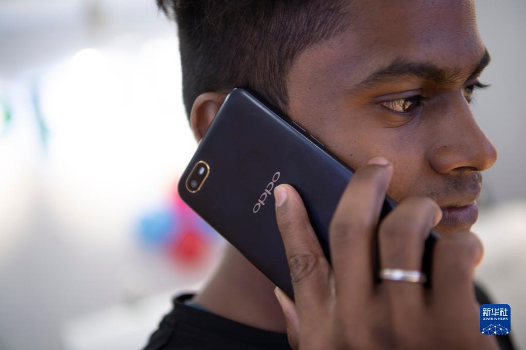 2019年10月8日,一名男子在印度金奈的一家商場使用中國品牌的手機(jī)。新華社記者呂小煒攝