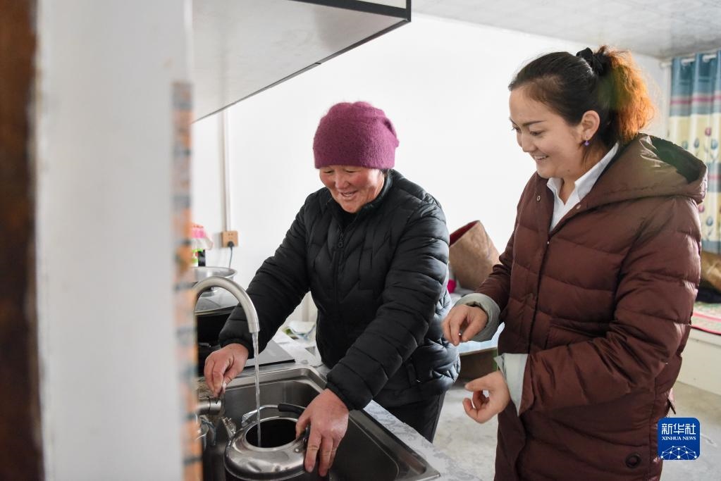 在新疆福??h解特阿熱勒鎮(zhèn)京什開薩爾村,村干部(右)來到前不久剛接通自來水的村民家中了解水質情況(2021年11月25日攝)。新華社記者 丁磊