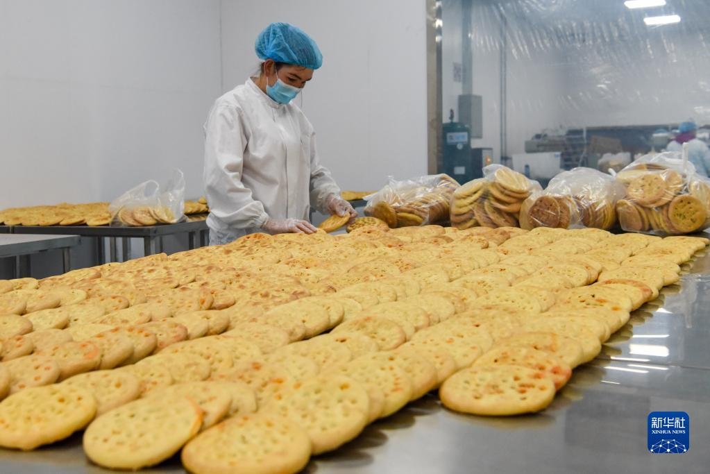 在新疆霍爾果斯馕產(chǎn)業(yè)園,工作人員在分揀剛做好的馕(2021年2月5日攝)。新華社記者 丁磊 攝
