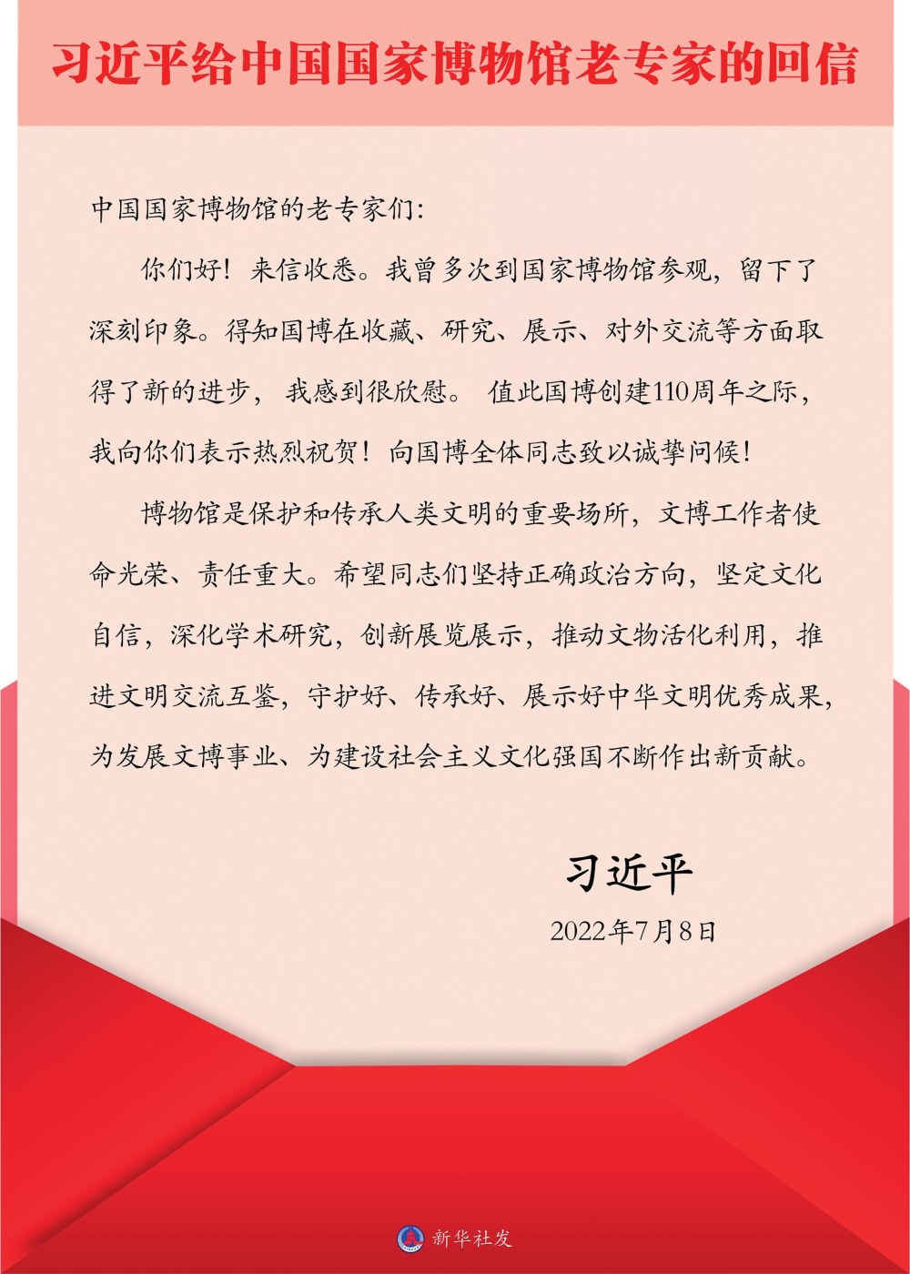 7月8日,中共中央總書記、國(guó)家主席、中央軍委主席習(xí)近平給中國(guó)國(guó)家博物館的老專家回信,在國(guó)博創(chuàng)建110周年之際,向國(guó)博全體同志致以熱烈祝賀和誠(chéng)摯問(wèn)候。