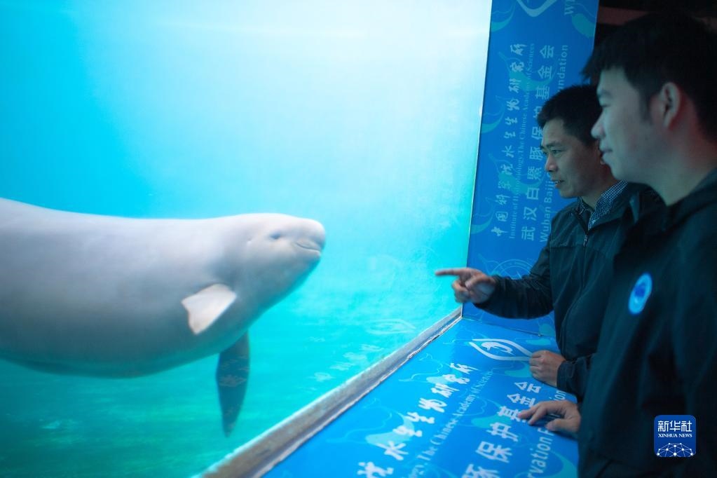 10月18日,在湖北武漢的中科院水生所白鱀豚館,長(zhǎng)期從事長(zhǎng)江江豚保護(hù)研究工作的郝玉江副研究員(左)在向?qū)W生講解江豚行為習(xí)慣。新華社發(fā)