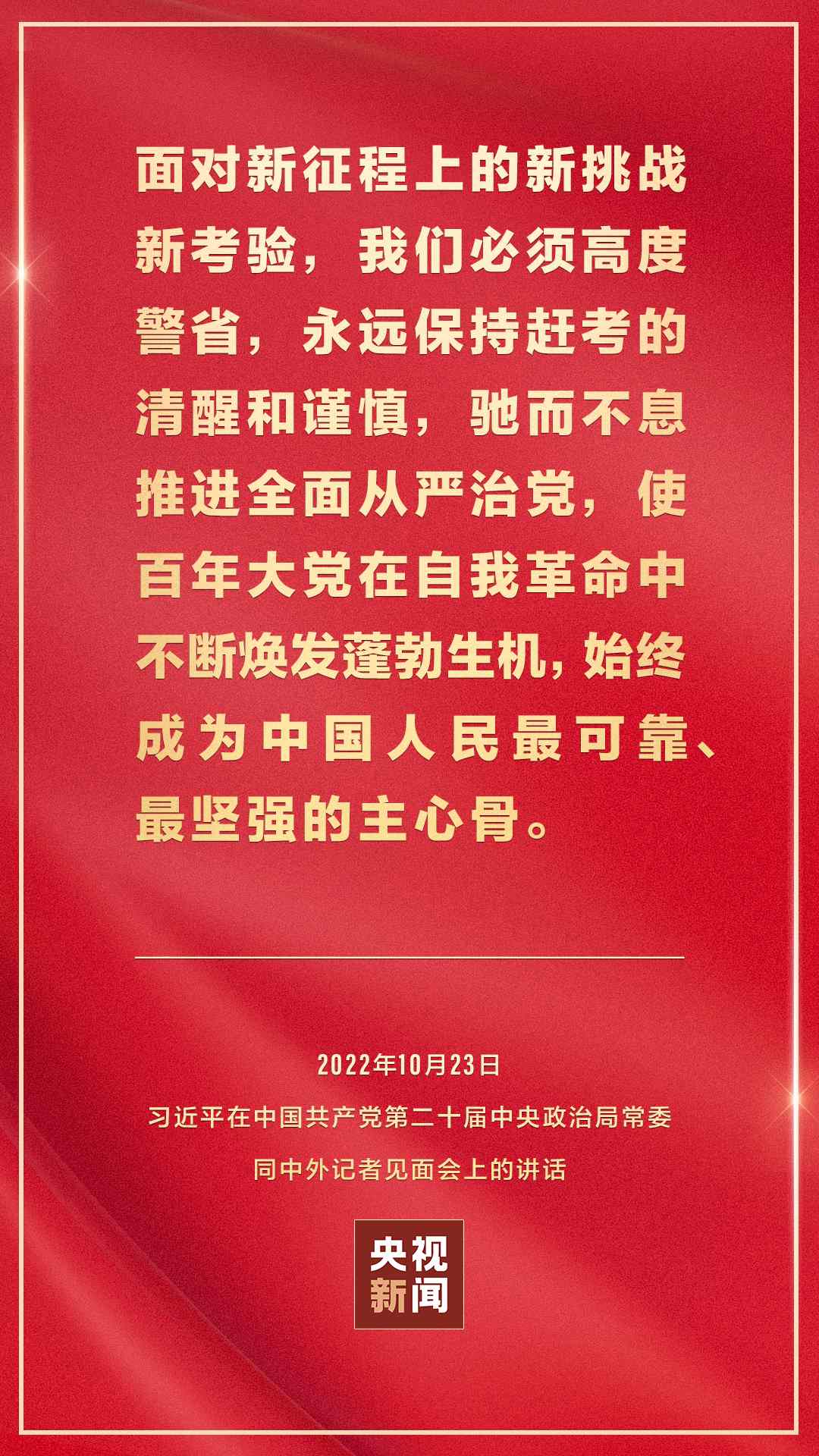 在中國共產(chǎn)黨第二十屆中央委員會第一次全體會議上當選的中共中央總書記習近平和中共中央政治局常委李強、趙樂際、王滬寧、蔡奇、丁薛祥、李希,23日中午在人民大會堂同采訪中共二十大的中外記者見面。習近平發(fā)表重要講話。