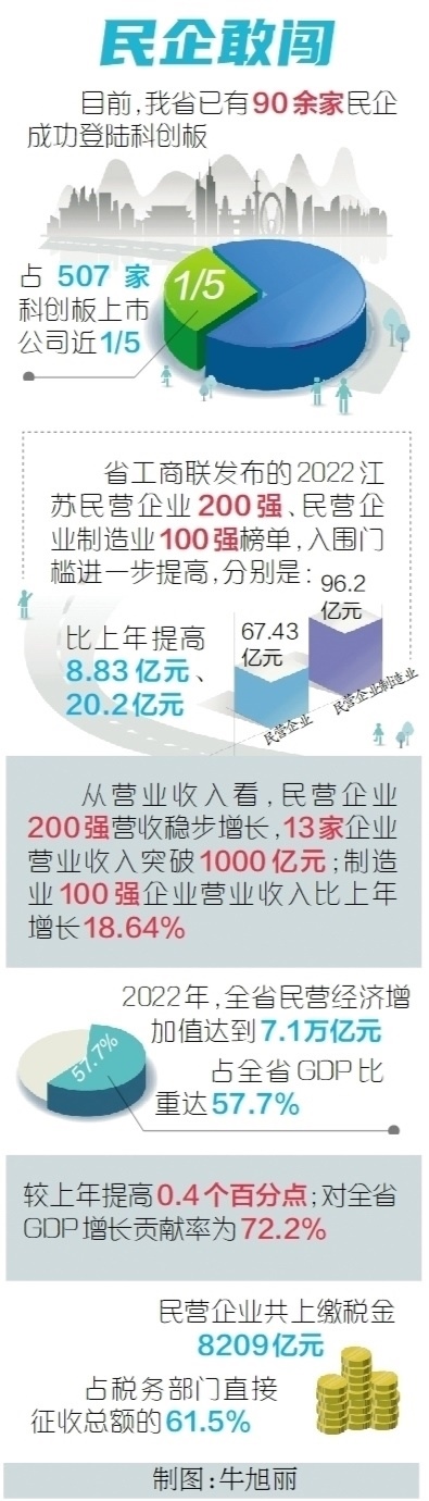 勇立實(shí)業(yè)潮頭,爭當(dāng)奮楫搏浪的“水手”,另一份榜單同樣能佐證江蘇民企的勇毅前行。去年9月,省工商聯(lián)發(fā)布2022江蘇民營企業(yè)200強(qiáng)、民營企業(yè)制造業(yè)100強(qiáng)榜單,入圍門檻進(jìn)一步提高,分別達(dá)67.43億元、96.2億元,比上年提高8.83億元、20.2億元。從營業(yè)收入看,民營企業(yè)200強(qiáng)營收穩(wěn)步增長,13家企業(yè)營業(yè)收入突破1000億元;制造業(yè)100強(qiáng)企業(yè)營業(yè)收入比上年增長18.64%。