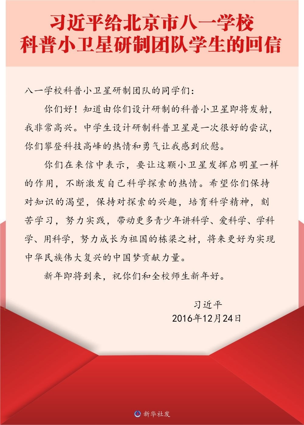 北京市八一學(xué)校是習(xí)近平總書(shū)記的母校。2016年底,八一學(xué)校的學(xué)生們給習(xí)近平總書(shū)記寫(xiě)信,報(bào)告了他們參與設(shè)計(jì)研制的科普小衛(wèi)星即將發(fā)射的消息。很快,孩子們收到了總書(shū)記的回信。