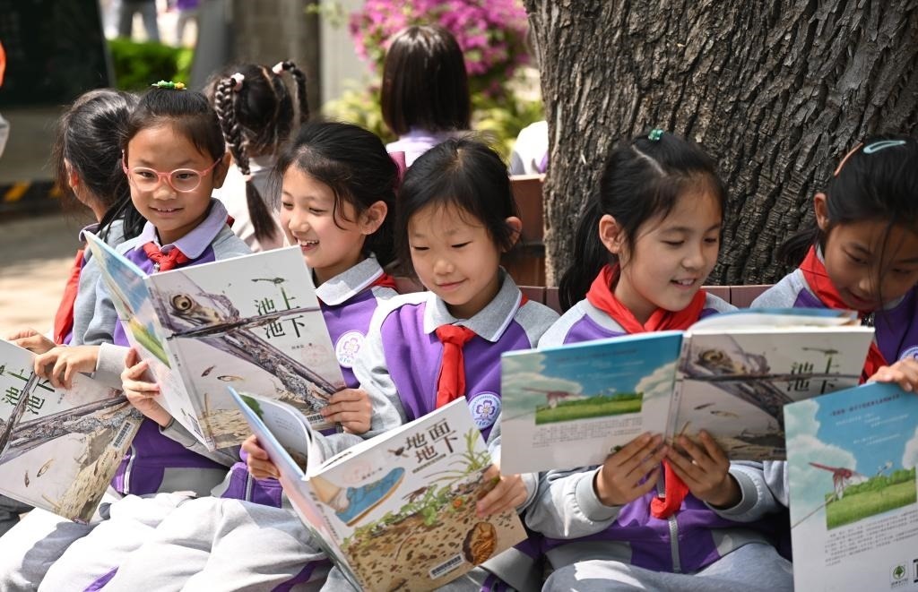 在她的校園里,有一棵“長(zhǎng)滿書的大樹”,掛滿了《神筆馬良》《西游記》《可愛的中國(guó)》等經(jīng)典書籍。教學(xué)樓走廊里、教室里,隨處可見各種圖書。踏著閱讀的階梯,祖國(guó)的花朵茁壯成長(zhǎng)。