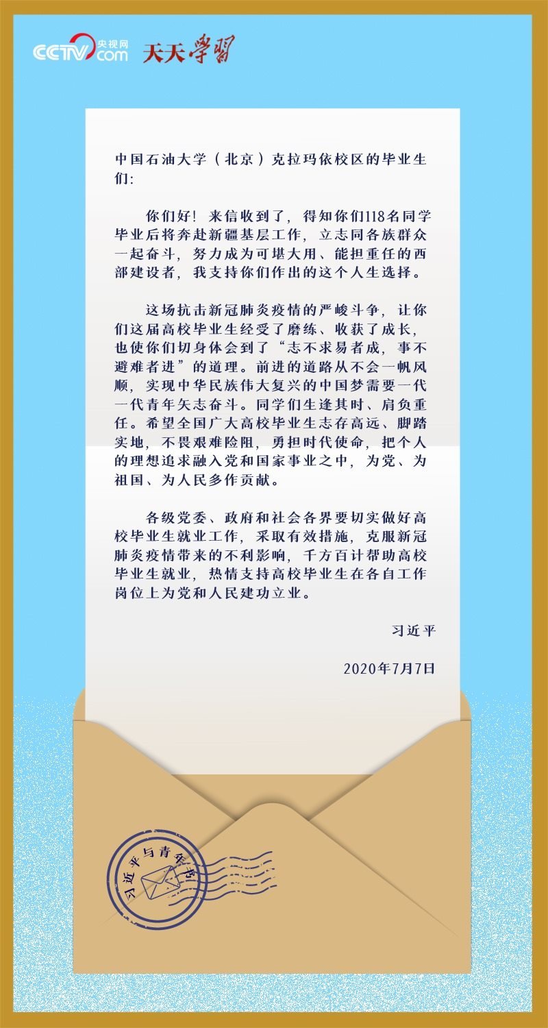 2020年畢業(yè)季,中國(guó)石油大學(xué)(北京)克拉瑪依校區(qū)118名即將到新疆基層就業(yè)的大學(xué)生,在離開(kāi)母校之際,給習(xí)近平總書記寫信匯報(bào)了大學(xué)四年學(xué)習(xí)和思想上的收獲,表達(dá)了立志同各族群眾一起奮斗、建設(shè)美麗邊疆的決心。