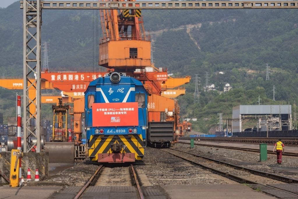 這是2023年4月27日,太平船務(wù)——西部陸海新通道江鐵海聯(lián)運(yùn)非洲專列在重慶果園港魚(yú)嘴站等待發(fā)車。