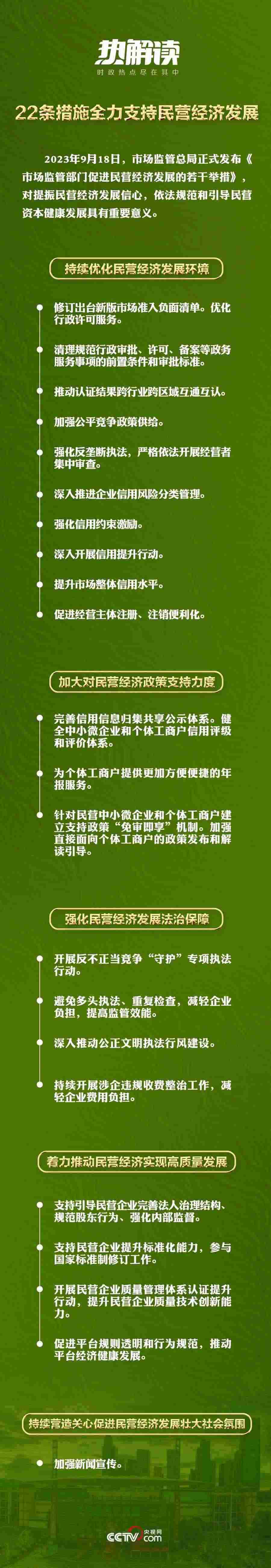 2023年7月14日,中共中央國務(wù)院出臺(tái)《關(guān)于促進(jìn)民營經(jīng)濟(jì)發(fā)展壯大的意見》,對(duì)促進(jìn)民營經(jīng)濟(jì)發(fā)展壯大作出新的重大部署。2023年9月18日,市場監(jiān)管總局發(fā)布《市場監(jiān)管部門促進(jìn)民營經(jīng)濟(jì)發(fā)展的若干舉措》,通過22條措施為全力支持民營經(jīng)濟(jì)發(fā)展設(shè)計(jì)了具體落實(shí)的“施工圖”。