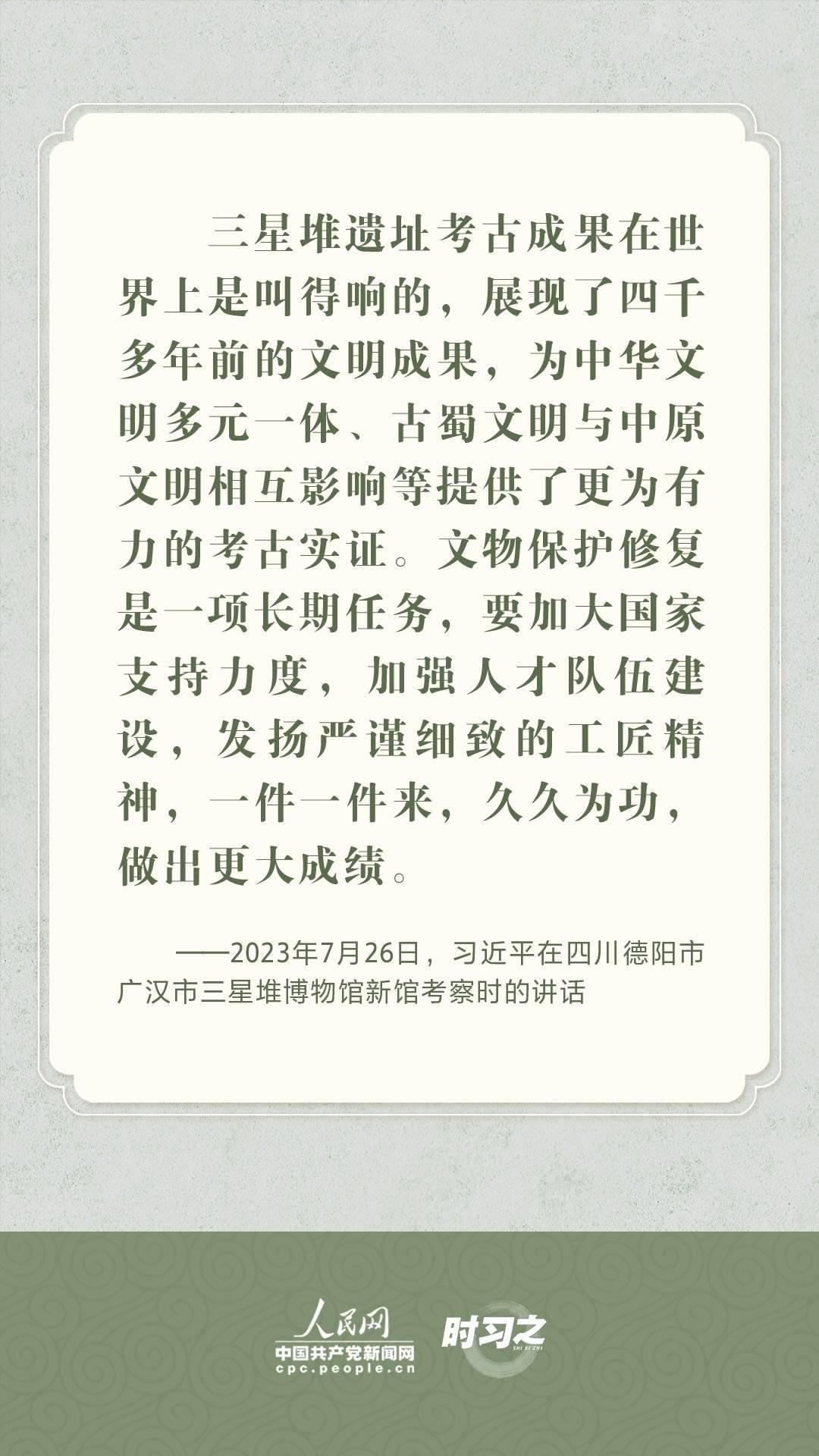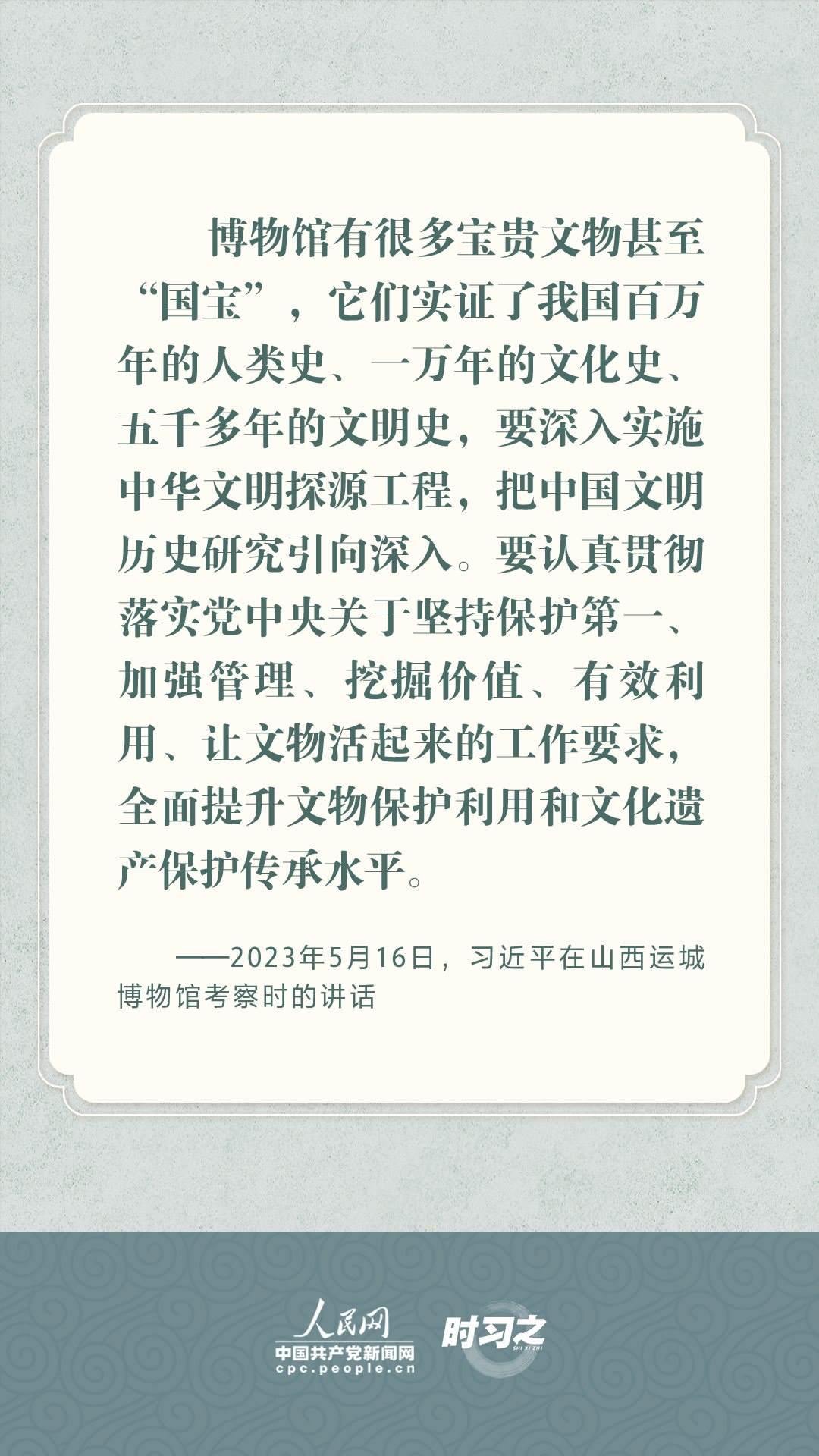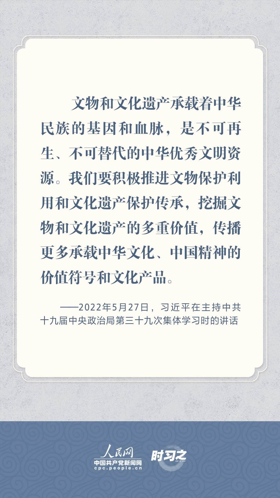 文物承載燦爛文明,傳承歷史文化,維系民族精神。習(xí)近平總書記站在中華民族和中華文明永續(xù)傳承的戰(zhàn)略高度,不斷強(qiáng)調(diào)保護(hù)傳承中華優(yōu)秀傳統(tǒng)文化,為增強(qiáng)文化自信、激發(fā)中華優(yōu)秀傳統(tǒng)文化的生機(jī)與活力注入了強(qiáng)大精神動(dòng)力。