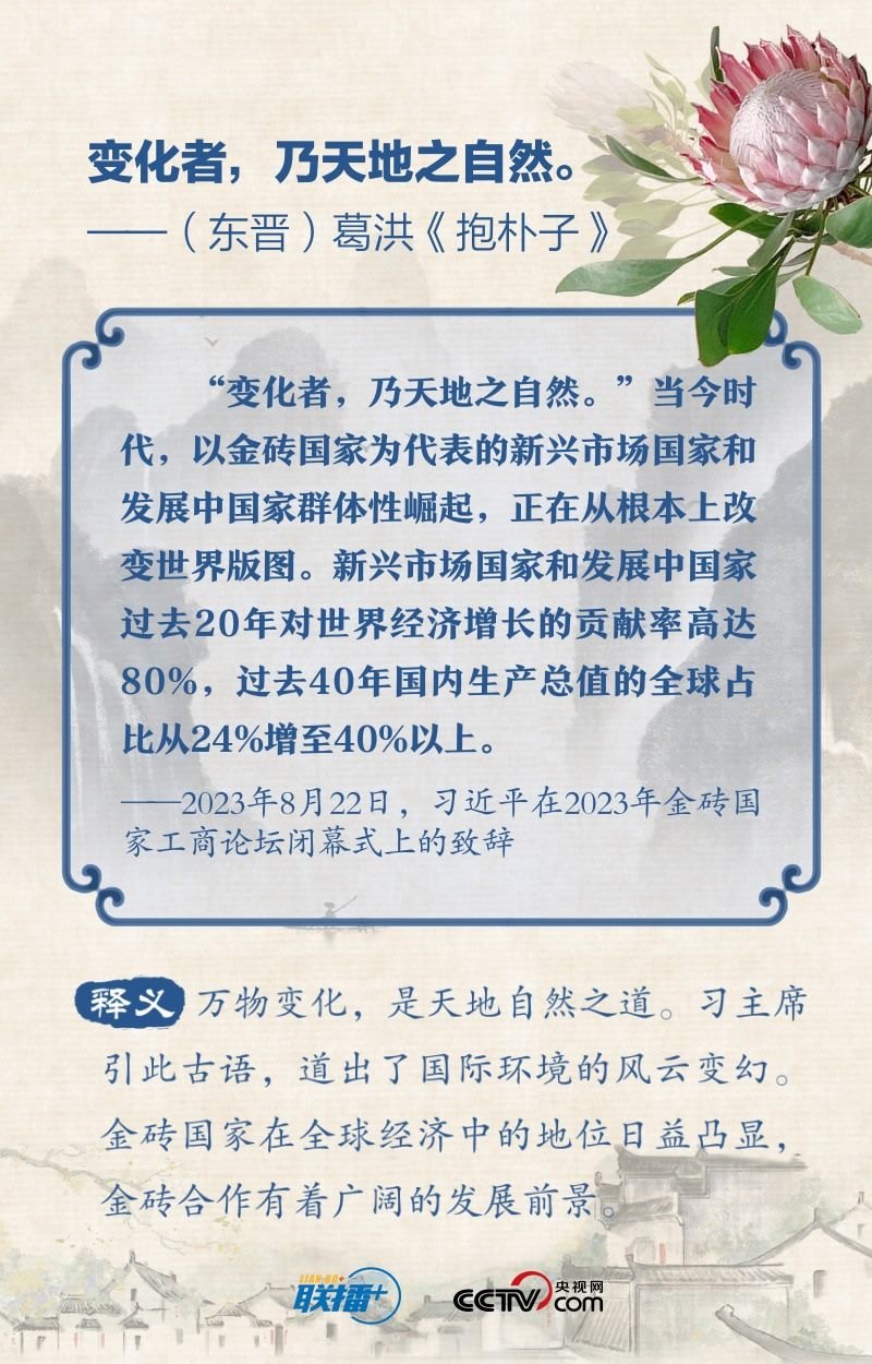 “順理而舉易為力,背時而動難為功”“變化者,乃天地之自然”“利莫大于治,害莫大于亂”…… 2023年的“金磚時間”里,習近平主席多次在講話中引經(jīng)據(jù)典,闡述金磚國家的合作與發(fā)展之道。央視網(wǎng)《聯(lián)播+》特擷取習主席用典金句,與您一起學習。