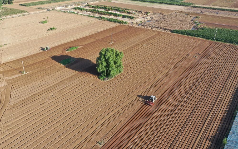 8月18日,在河北省涿州市刁窩鎮(zhèn)潘各莊村,農民駕駛農業(yè)機械進行復耕補種作業(yè)(無人機照片)。