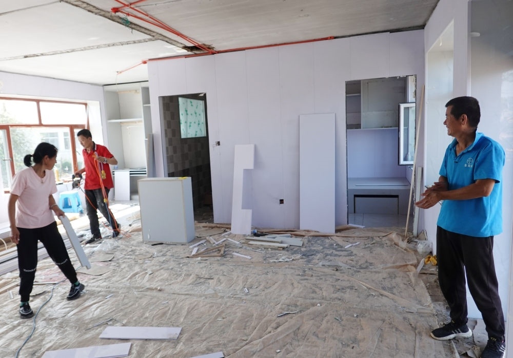 9月7日,黑龍江省尚志市老街基鄉(xiāng)龍王廟村村民包喜文(右)查看受損房屋的裝修進度。