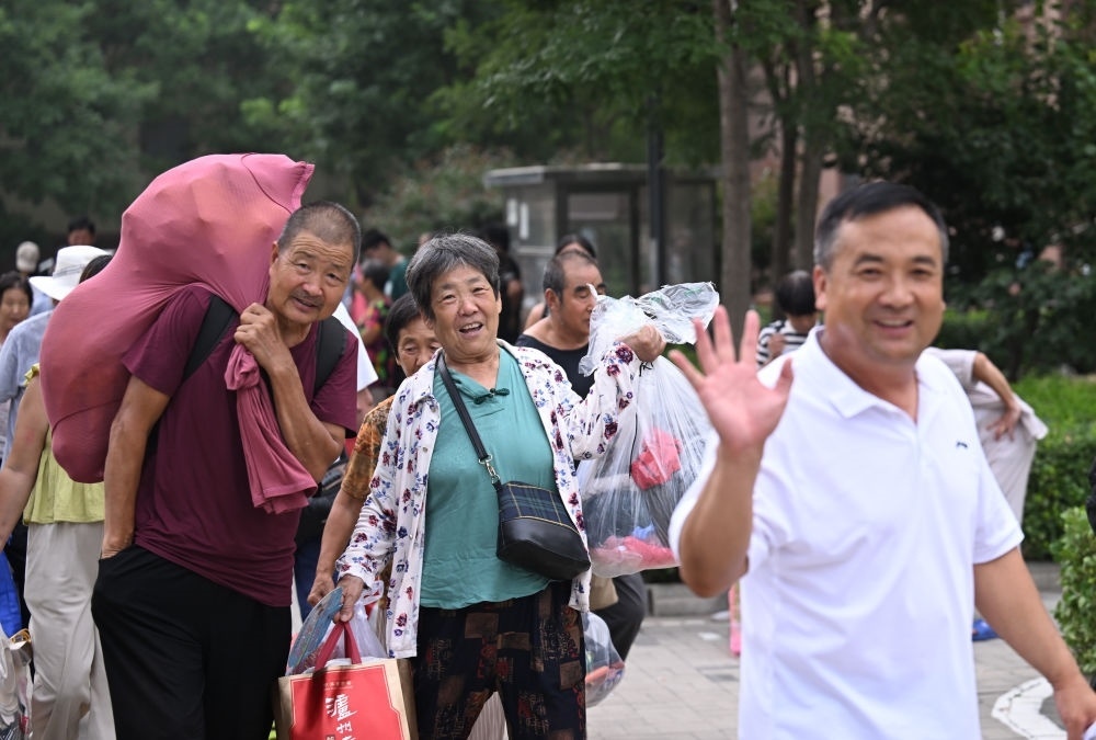 8月20日,在天津市西青區(qū)赤龍南街道一臨時安置點,村民收拾行李準備回家。當日,天津市靜海區(qū)東淀蓄滯洪區(qū)37000余名轉移安置人員全部返回臺頭鎮(zhèn)、獨流鎮(zhèn)、王口鎮(zhèn)等地。