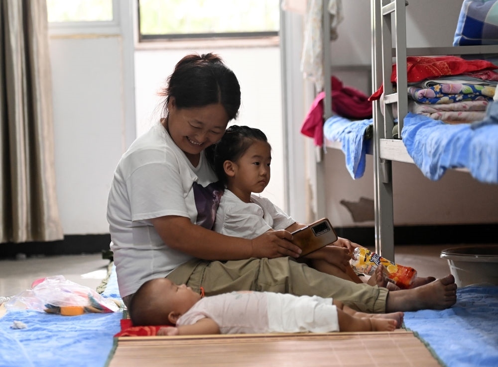 8月12日,在天津市靜海區(qū)大邱莊中學集中安置點,轉移群眾在宿舍內照看孩子。