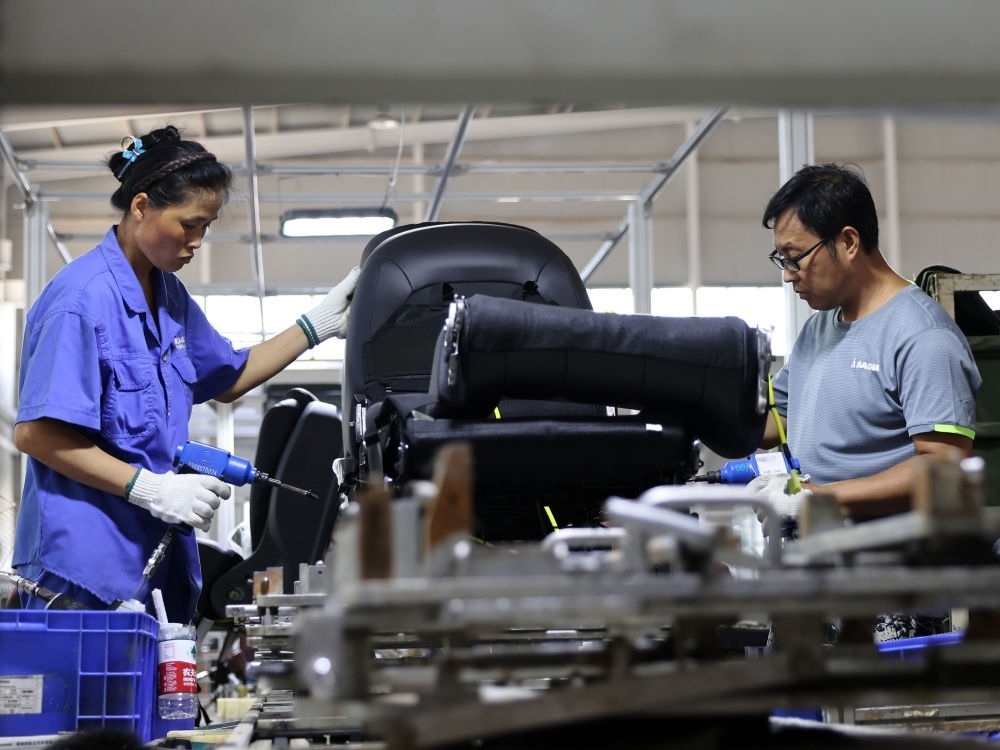 8月19日,工人在位于河北省涿州市的麥格納宏立汽車系統(tǒng)(河北)有限公司生產車間工作。