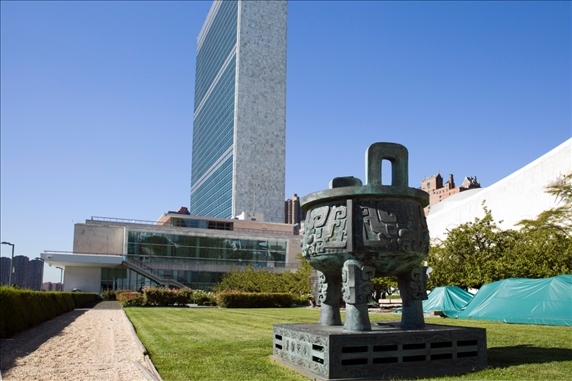 這是2015年9月15日在美國(guó)紐約聯(lián)合國(guó)總部拍攝的“世紀(jì)寶鼎”。“世紀(jì)寶鼎”是中國(guó)在1995年聯(lián)合國(guó)成立50周年之際,贈(zèng)送給聯(lián)合國(guó)的禮物。新華社記者 李木子 攝