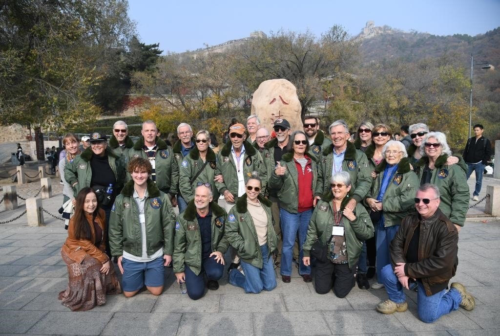 2023年10月29日,飛虎隊(duì)老兵莫耶一行人在北京八達(dá)嶺長(zhǎng)城合影留念。當(dāng)日,美中航空遺產(chǎn)基金會(huì)訪華代表團(tuán)成員陸續(xù)抵達(dá)北京。新華社記者 任超 攝