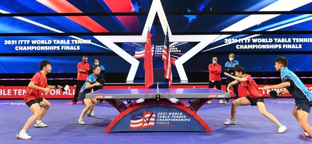 這是中美混雙組合在2021年11月下旬舉行的休斯敦世界乒乓球錦標(biāo)賽期間合練。中美選手在休斯敦世乒賽上聯(lián)合組隊(duì)出戰(zhàn)混合雙打比賽,紀(jì)念中美“乒乓外交”50周年。新華社記者 吳曉凌 攝