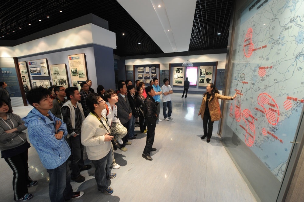 ?↑ 在鹽城新四軍紀(jì)念館內(nèi),講解員在向觀眾介紹南方紅軍游擊隊(duì)整編為新四軍示意圖(2011年5月26日攝)。