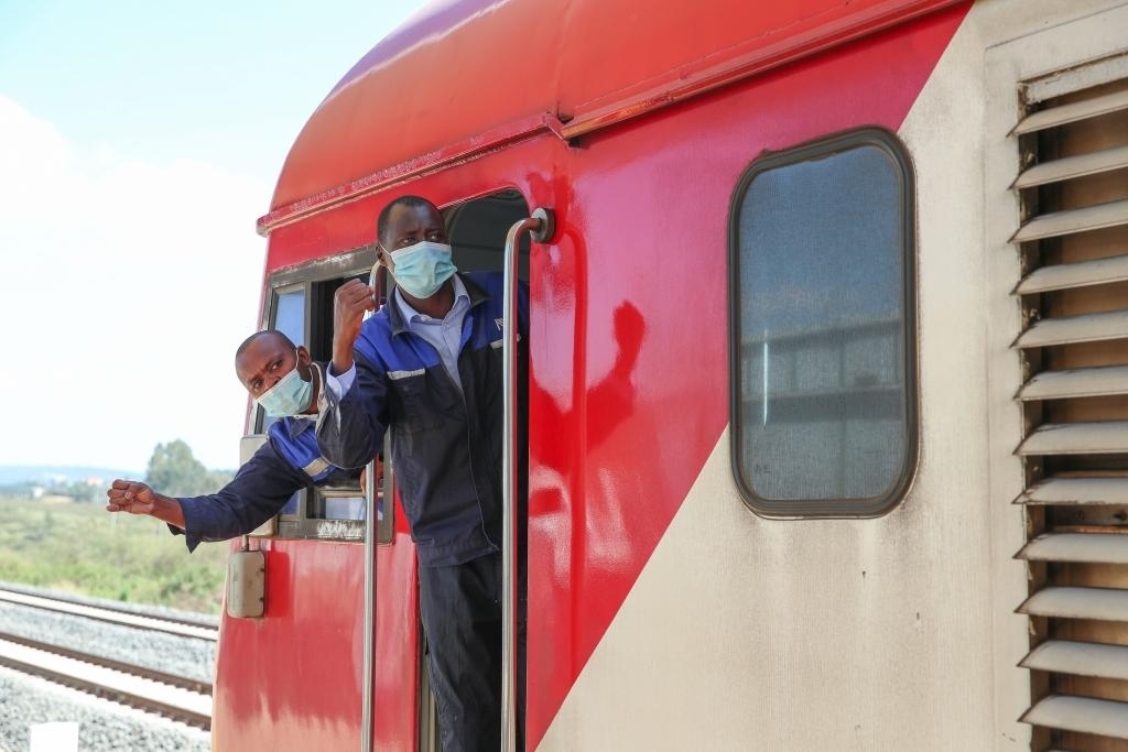 2022年3月25日,在肯尼亞內(nèi)羅畢,蒙內(nèi)鐵路肯方機車獨立班組成員與站臺工作人員確認安全。