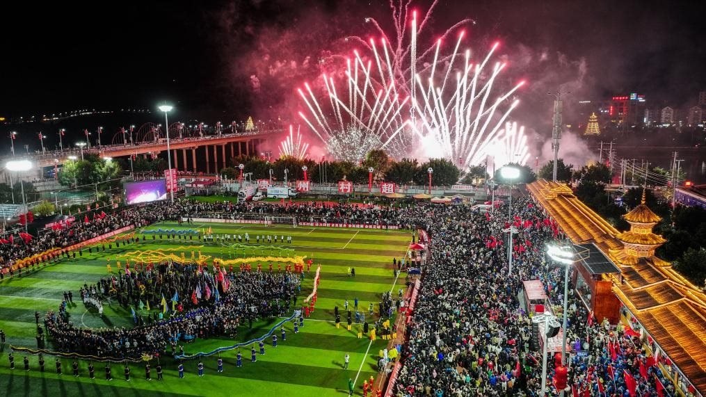 2月3日,音樂(lè)煙花秀在榕江縣舉辦的貴州“村超村晚”上演(無(wú)人機(jī)照片)。新華社記者劉續(xù) 攝