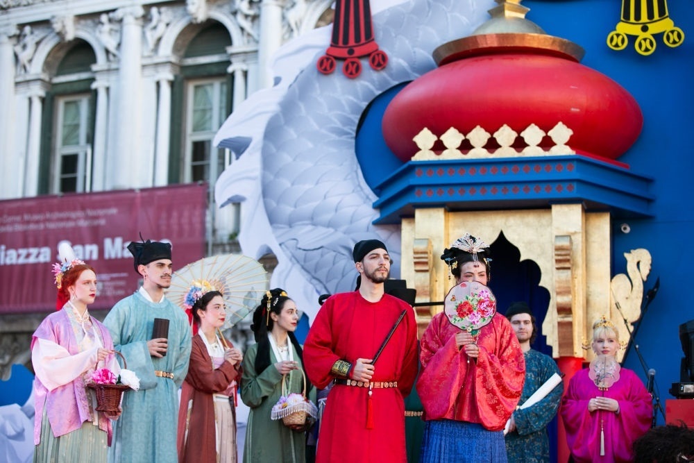 2024年2月13日,在意大利威尼斯,志愿者身著漢服進行表演。新華社記者 李京 攝
