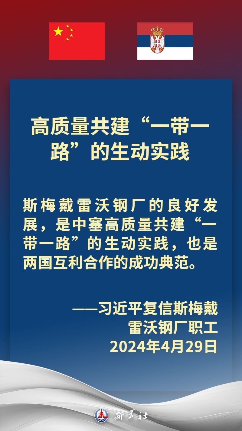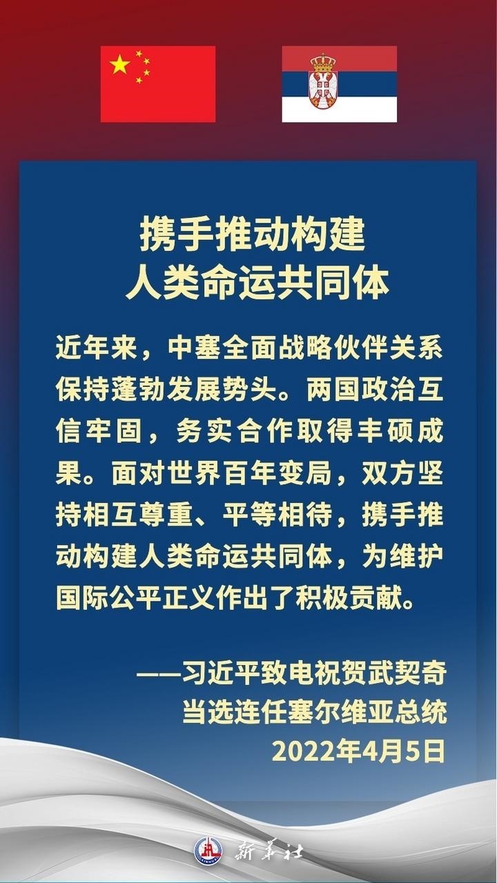 塞爾維亞是中國在中東歐地區(qū)首個全面戰(zhàn)略伙伴。近年來,在習(xí)近平主席和武契奇總統(tǒng)戰(zhàn)略引領(lǐng)下,中塞關(guān)系保持高水平運(yùn)行,雙方堅定支持彼此核心利益和重大關(guān)切,兩國政治互信牢固,高質(zhì)量共建“一帶一路”取得豐碩成果,在多邊領(lǐng)域協(xié)調(diào)緊密。習(xí)近平主席多次在重要場合提及,中國和塞爾維亞是“鐵桿朋友”。