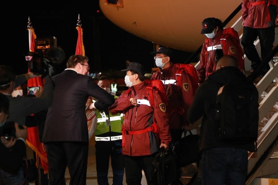 中國(guó)醫(yī)療團(tuán)隊(duì)在貝爾格萊德尼古拉·特斯拉機(jī)場(chǎng)降落時(shí)已是深夜。武契奇率領(lǐng)塞方多名高級(jí)官員到機(jī)場(chǎng)迎接。疫情期間不建議握手,于是這位塞爾維亞領(lǐng)導(dǎo)人選擇和中國(guó)專家團(tuán)成員一一碰肘以示尊重。對(duì)中國(guó)的及時(shí)支援心懷感激,他還在機(jī)場(chǎng)親吻了一面五星紅旗。