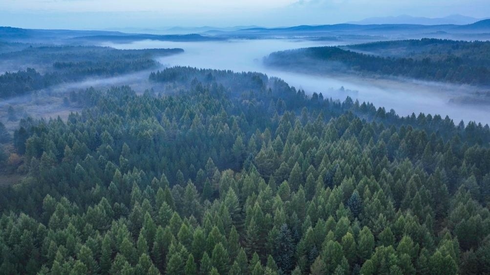 青霧繚繞的塞罕壩(無人機照片,2023年9月9日攝)。新華社發(fā)(劉滿倉攝)